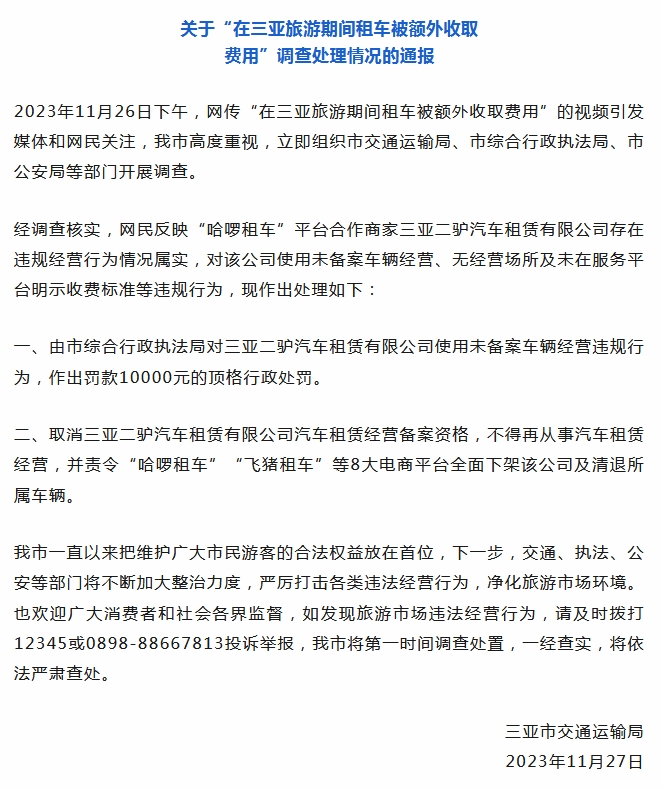 經(jīng)調(diào)查核實(shí),網(wǎng)民反映“哈啰租車”平臺(tái)合作商家三亞二驢汽車租賃有限公司存在違規(guī)經(jīng)營行為情況屬實(shí),對(duì)該公司使用未備案車輛經(jīng)營、無經(jīng)營場(chǎng)所及未在服務(wù)平臺(tái)明示收費(fèi)標(biāo)準(zhǔn)等違規(guī)行為,現(xiàn)作出處理如下:
