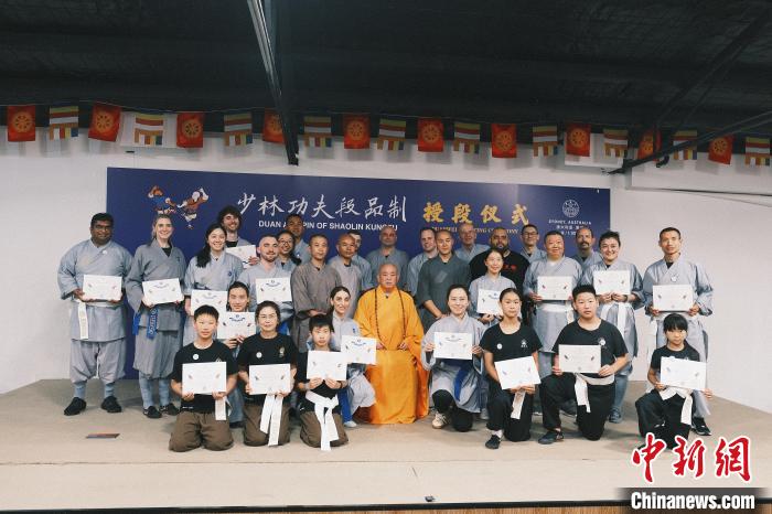 當(dāng)?shù)貢r(shí)間12月1日,澳大利亞少林寺禪武堂于1日在悉尼隆重舉行大洋洲少林功夫段品制授段儀式,少林寺方丈釋永信親臨現(xiàn)場,為當(dāng)?shù)厣倭止Ψ驉酆谜呤谟瓒挝弧?張浩鑫 攝)