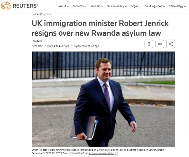 報(bào)道稱,詹里克對(duì)英國(guó)政府當(dāng)日公布的“盧旺達(dá)安全(庇護(hù)和移民)法案草案”持有不同意見。他在一封辭職信中表示,該立法是在2024年英國(guó)大選之前解決移民危機(jī)的“最后機(jī)會(huì)之一”。