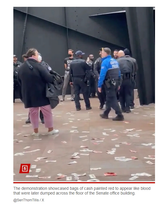 據(jù)美國《紐約郵報》報道,在抗議示威活動中,有成袋的美元鈔票被涂上紅色,看上去“血跡斑斑”,并被傾倒在大廳的地板上。