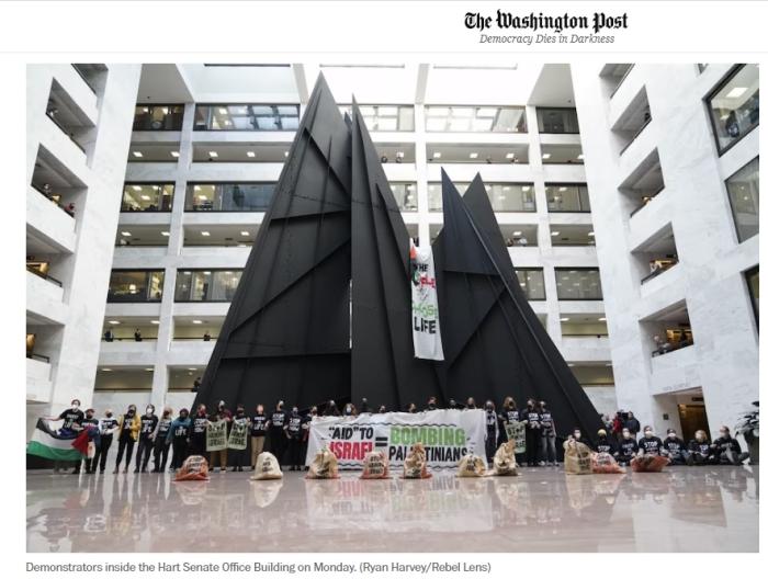 報道稱,抗議者身穿寫有“立即停止(援助)武器”字樣的黑色T恤,高喊“立即?;?!立即?;?!”。他們還舉著寫有“援助以色列=轟炸巴勒斯坦人”的條幅。