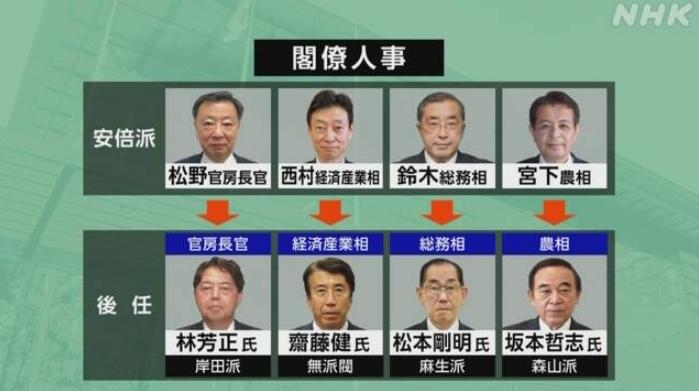 據(jù)報道,岸田將會把官房長官、經(jīng)產(chǎn)相、總務(wù)相和農(nóng)相四個重要職位換人,此前任外相的林芳正將接替松野博一擔(dān)任官房長官,經(jīng)產(chǎn)相、總務(wù)相和農(nóng)相將分別由齋藤健、松本剛明和坂本哲志擔(dān)任。四人均不屬于安倍派成員。