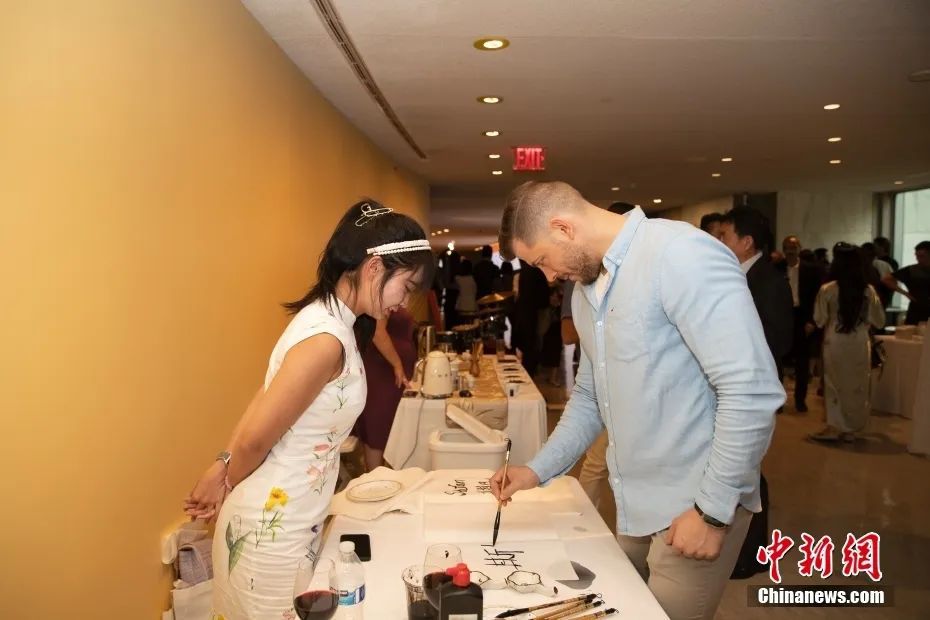 資料圖:當地時間6月29日晚,“何以文明”特展發(fā)布儀式在紐約聯合國總部舉行,與會嘉賓體驗中國書法。中新社記者 廖攀 攝