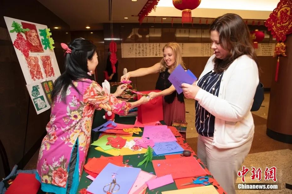 資料圖:來賓在招待會現場體驗中國傳統年俗文化剪紙。中新社記者 廖攀 攝