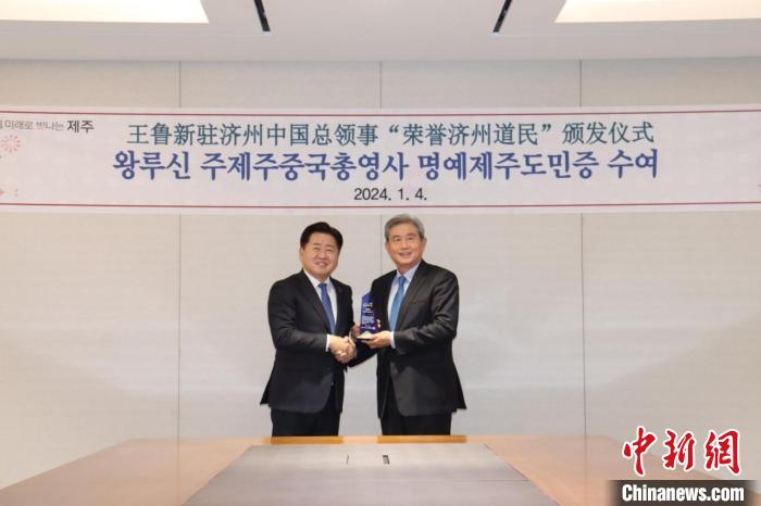 1月4日,韓國濟州道知事吳憐勛(左)向中國駐濟州總領事王魯新頒授“榮譽濟州道民”證書。(中國駐濟州總領事館供圖)