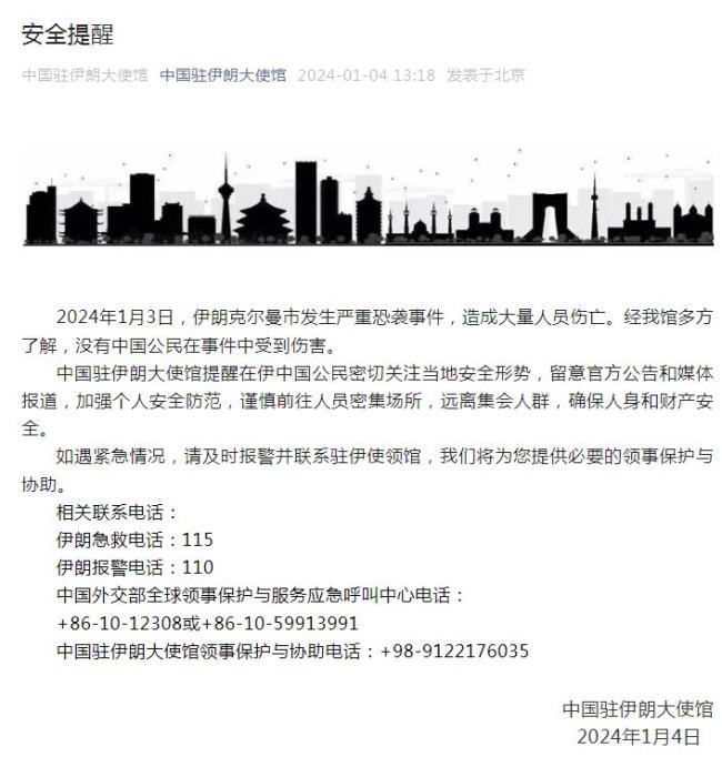 中新網(wǎng)1月4日電 據(jù)中國駐伊朗大使館微信公眾號消息,2024年1月3日,伊朗克爾曼市發(fā)生嚴重恐襲事件,造成大量人員傷亡。經(jīng)大使館多方了解,沒有中國公民在事件中受到傷害。