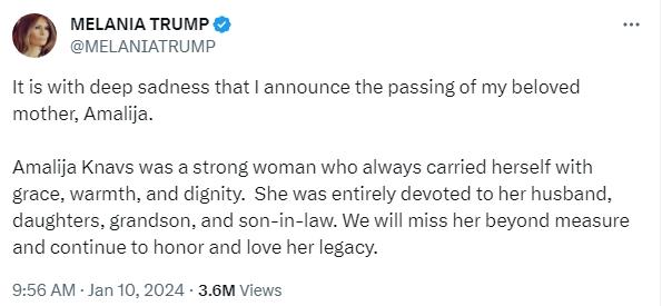 梅拉尼婭在X平臺(tái)上發(fā)文稱(chēng),“我懷著沉痛的心情宣布,我深?lèi)?ài)的母親阿瑪利加去世了。阿瑪利加·納夫斯是一名堅(jiān)強(qiáng)的女性,她總是舉止優(yōu)雅、溫暖、莊重?!彼龑?xiě)道,“她深深地愛(ài)著她的丈夫、女兒、外孫和女婿。我們會(huì)無(wú)比地懷念她,也會(huì)繼續(xù)尊重和愛(ài)戴她留下的寶貴財(cái)富。”