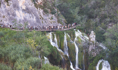 克羅地亞普利特維采湖國(guó)家公園是中國(guó)九寨溝國(guó)家級(jí)自然保護(hù)區(qū)的“姐妹”自然遺產(chǎn)地。兩者同屬喀斯特地貌,是世界非常罕見的冷水鈣華景觀。中國(guó)科學(xué)院成都生物研究所與克羅地亞薩格勒布大學(xué)合作成立“中國(guó)—克羅地亞生物多樣性和生態(tài)系統(tǒng)服務(wù)‘一帶一路’聯(lián)合實(shí)驗(yàn)室”,為兩國(guó)世界自然遺產(chǎn)地生態(tài)保育作出重要貢獻(xiàn)。圖為當(dāng)?shù)赜慰驮谄绽鼐S采湖國(guó)家公園參觀。