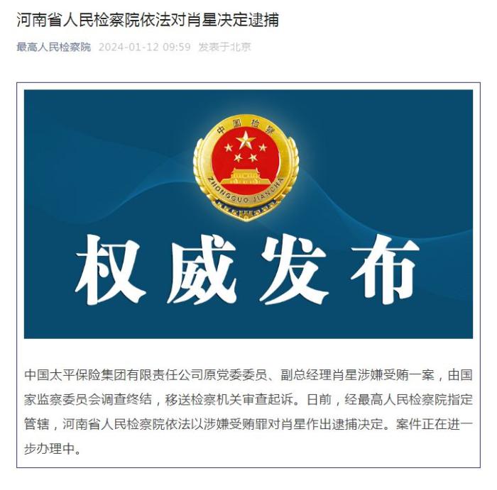 中新網(wǎng)1月12日電 據(jù)最高人民檢察院微信公眾號消息,中國太平保險集團(tuán)有限責(zé)任公司原黨委委員、副總經(jīng)理肖星涉嫌受賄一案,由國家監(jiān)察委員會調(diào)查終結(jié),移送檢察機(jī)關(guān)審查起訴。日前,經(jīng)最高人民檢察院指定管轄,河南省人民檢察院依法以涉嫌受賄罪對肖星作出逮捕決定。案件正在進(jìn)一步辦理中。