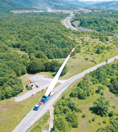 回憶起項目建設(shè)過程,李守志很是感慨:“在這樣一個森林茂密地區(qū)建設(shè)風(fēng)電項目,風(fēng)機葉片的運輸、舉升都受到不同程度限制,施工難度很大。為了克服這些困難,我們前期做了大量調(diào)研和準(zhǔn)備工作?!彼榻B,建一臺風(fēng)機需要使用約300立方米的混凝土,且必須在一定時間內(nèi)澆筑完成,需要3個混凝土站同時送進(jìn)場。為此,工程隊在山間鋪設(shè)了60公里左右的硬化路面,并對施工流程進(jìn)行了周密計劃和協(xié)調(diào)安排。