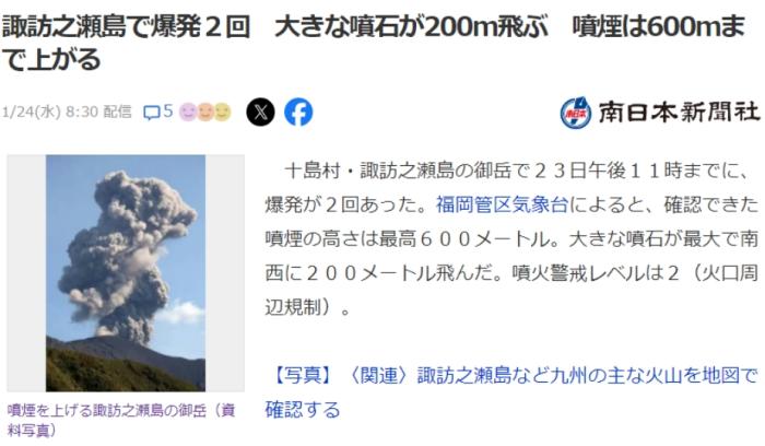 福岡管區(qū)氣象臺發(fā)布消息稱,噴出的煙柱最高達600米,巨大的火山石向外飛出200米。目前,當地已經將火山噴發(fā)警戒提高到2級,火山口周邊區(qū)域禁止入內。
