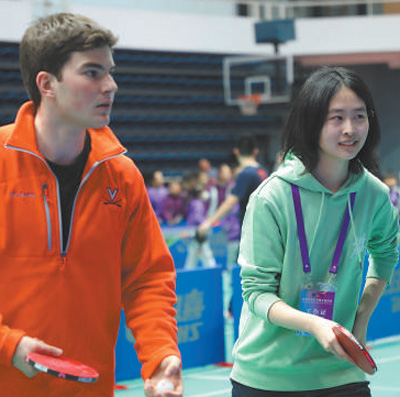 瀟灑的發(fā)球,靈活的走位,穩(wěn)健的揮拍擊球,弗吉尼亞大學學生謝家駿和清華大學學生李嘉懿頻頻配合得分、擊掌慶祝?!半m然是第一次搭檔,但我們配合很默契。我中文不太好,乒乓球成了我們最好的交流語言?!敝x家駿說,和中國朋友一起贏得比賽感到十分開心,希望能第一時間把比賽視頻發(fā)給遠在美國的媽媽看。