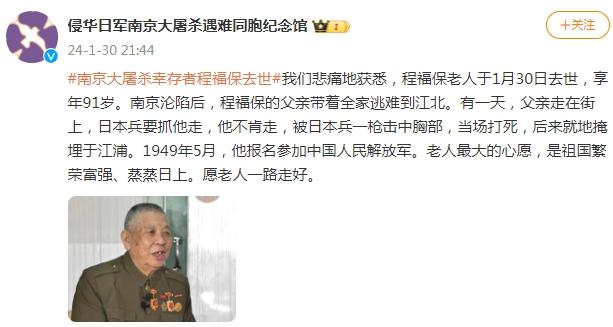中新網(wǎng)1月31日電 據(jù)侵華日軍南京大屠殺遇難同胞紀(jì)念館官方微博消息,南京大屠殺幸存者程福保于2024年1月30日去世,享年91歲。