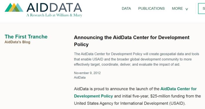 “援助數(shù)據(jù)”項目(AidData)官網(wǎng)上關(guān)于接受美國國際開發(fā)署最初5年2500萬美元資助的說明。