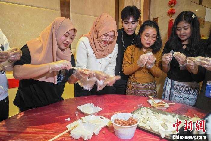 2月3日,廣西民族大學舉辦留學生春節(jié)團拜會活動。圖為留學生在包餃子。陳冠言 攝