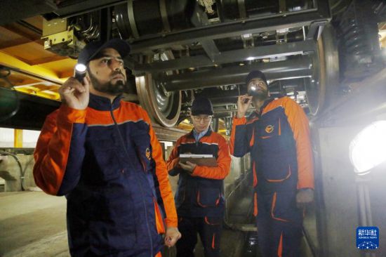 2月1日,巴基斯坦拉合爾軌道交通橙線項(xiàng)目中巴方員工在檢修列車。新華社發(fā)(艾哈邁德·卡邁勒攝)
