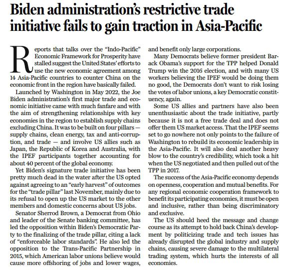 如今美國(guó)的一些盟友及伙伴也開始對(duì)IPEF失去了熱情,部分原因在于該框架并非自由貿(mào)易協(xié)定,也沒有提供給他們進(jìn)入美國(guó)市場(chǎng)的機(jī)會(huì)。IPEF似乎已經(jīng)是“窮途末路”,它的處境,映證的是美國(guó)在重塑亞太地區(qū)經(jīng)濟(jì)領(lǐng)導(dǎo)力方面的失敗,也令美國(guó)自2017年退出TPP后再次“信譽(yù)掃地”。