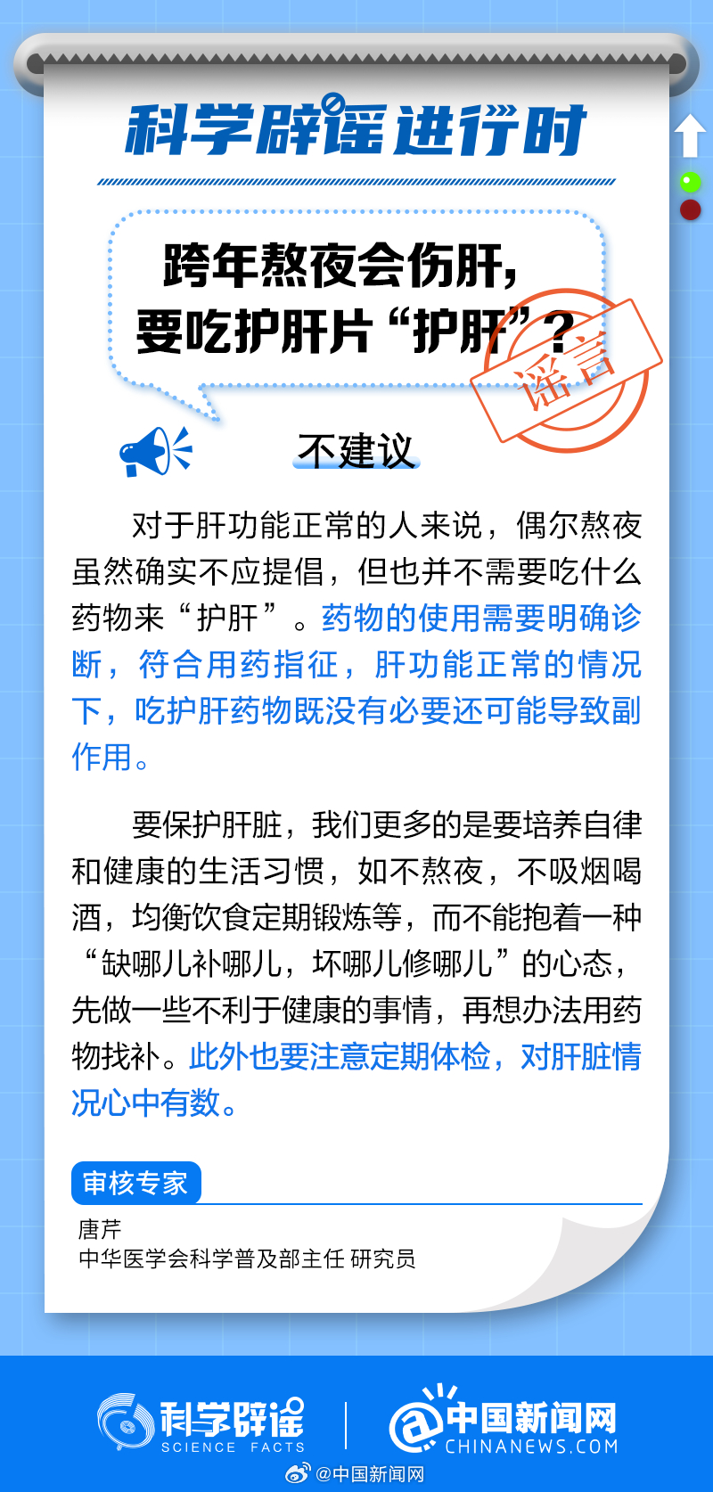 中新網(wǎng)2月10日電 對于肝功能正常的人來說,偶爾熬夜不需要吃什么藥物來“護(hù)肝”。藥物的使用需要明確診斷,符合用藥指征,肝功能正常的情況下,吃護(hù)肝藥物既沒有必要還可能導(dǎo)致副作用。要保護(hù)肝臟,我們更多的是要培養(yǎng)自律和健康的生活習(xí)慣,如不熬夜、不吸煙喝酒、均衡飲食、定期鍛煉等。(來源:@科學(xué)辟謠 中國新聞網(wǎng)微博)