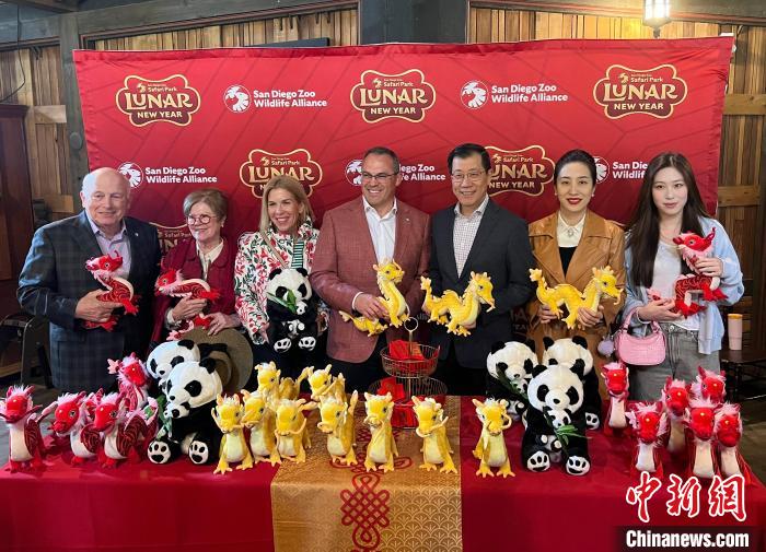 當天上午,印著祥龍圖案的紅燈籠、結(jié)滿果實的金桔樹和鮮花盛放的桃樹將圣地亞哥野生動物園裝點一新。中國駐洛杉磯總領(lǐng)事郭少春及夫人王薇、美國圣地亞哥動物園野生動植物聯(lián)盟總裁兼首席執(zhí)行官潘禮邦(Paul Baribault)與首席市場官穆德威(David Miller)等中美各界人士齊聚一堂,同當?shù)馗髯逡崦癖姽蚕泶汗?jié)的喜悅。