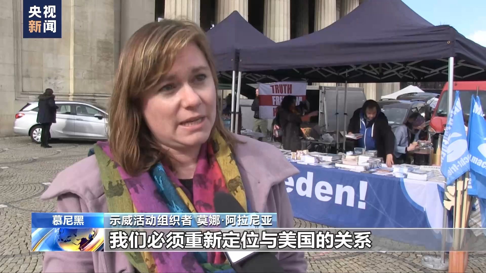 示威活動組織者 莫娜·阿拉尼亞:我們必須重新定位與美國的關系,重新定位與俄羅斯的關系,歐洲安全與和平架構需要與俄羅斯一起建立,而不是與俄羅斯敵對。