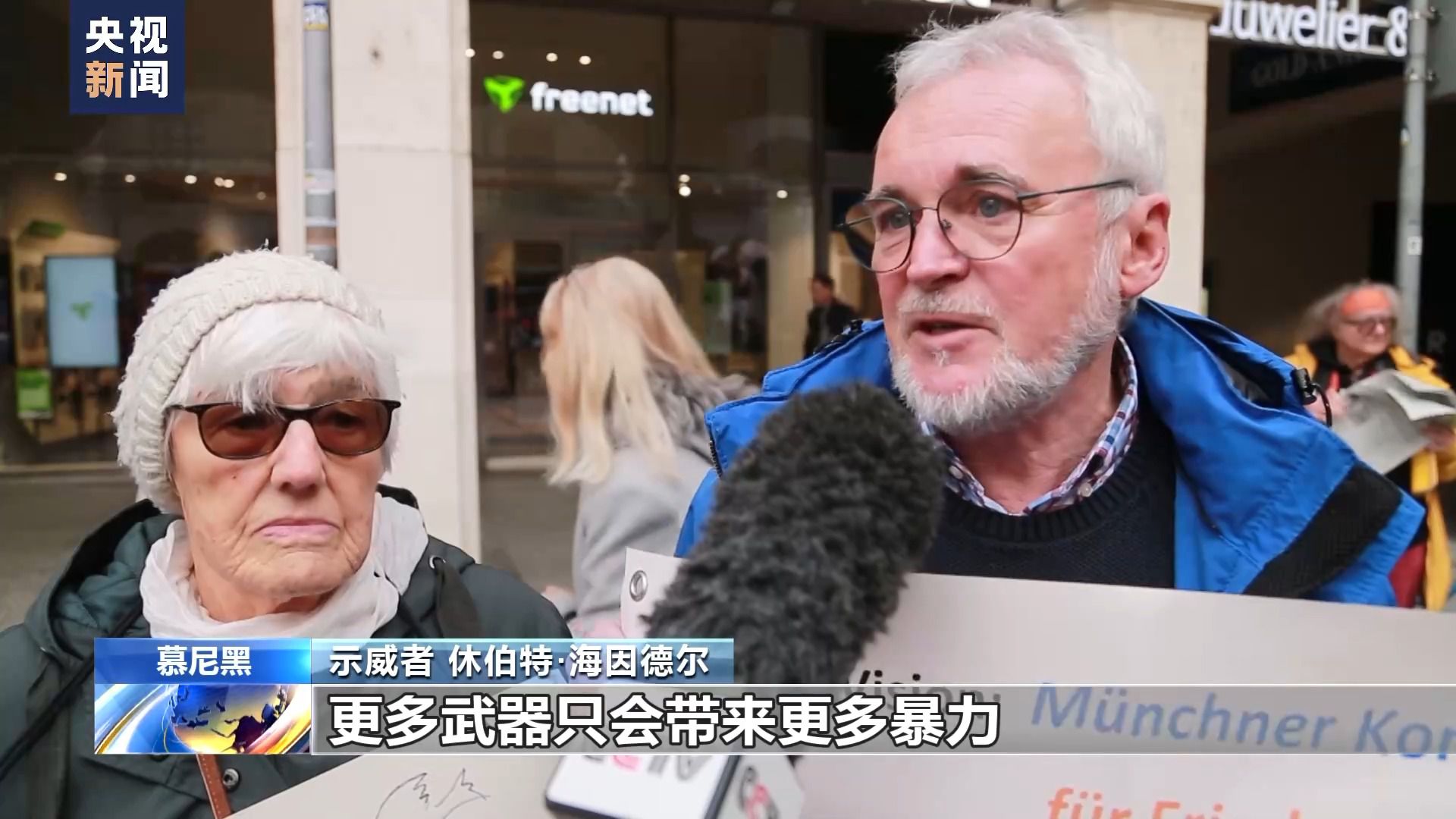 示威者 休伯特·海因德爾:更多武器只會帶來更多暴力,以暴制暴,我們希望通過抗議呼吁慕安會的(西方國家)與會人士擺脫軍事思維和手段,用和平思維來解決沖突。