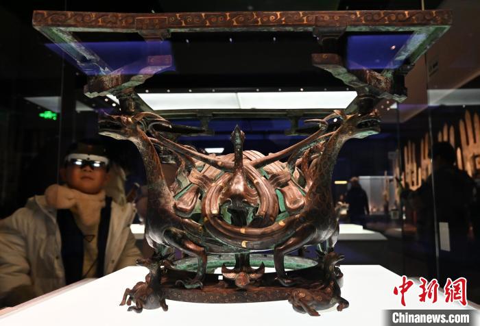 2月6日,民眾在河北博物院“戰(zhàn)國(guó)雄風(fēng) 古中山國(guó)”展廳參觀錯(cuò)金銀四龍四鳳銅方案座?!≈行律缬浾?翟羽佳 攝