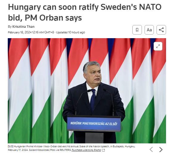 中新網(wǎng)2月18日電 據(jù)路透社報道,當?shù)貢r間17日,匈牙利總理歐爾班·維克托在一次演講中表示,匈牙利議會可能在2月晚些時候召開的春季會議上,批準瑞典加入北約。
