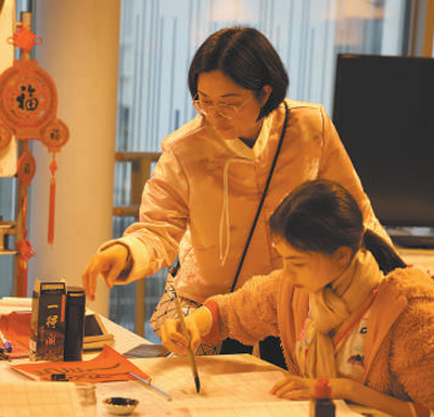 2月3日,在法國巴黎中國文化中心“走進中心過大年”活動中,學員體驗中國書法。