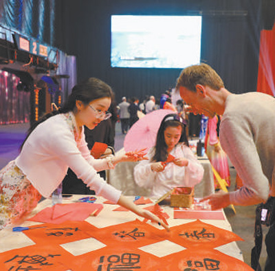 “龍”“?!薄按骸薄跁艏堈古_上,一幅幅書法作品傳遞著節(jié)慶的氛圍。當?shù)鼐用窭獱柲闷鹨粡垺案!弊?,向工作人員詢問寓意。拉莫爾就職的企業(yè)與中國有頻繁的業(yè)務往來,他曾兩次到訪中國。他說:“中國文化博大精深,中國人有著強烈的文化認同感。希望多多舉辦這樣的活動,讓更多人了解中國文化。”