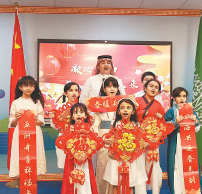 2月1日,在沙特阿拉伯智慧宮中文教育學院吉達學院,孩子們用中文合唱歌曲《新年好》。