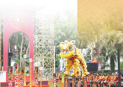 2月3日,在印尼雅加達翠貝卡廣場上,人們舉行舞獅表演喜迎新春。