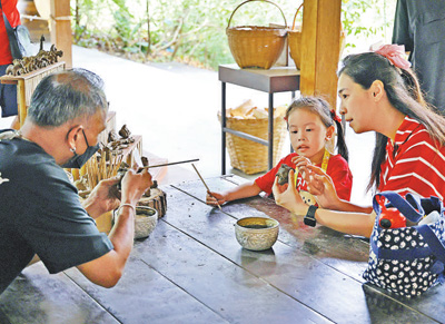 在曼谷桑普蘭濱江園有機(jī)農(nóng)場內(nèi),游客體驗(yàn)泰國傳統(tǒng)泥塑手工藝。