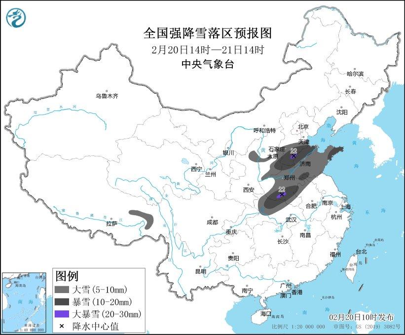 中新網(wǎng)2月20日電 據(jù)中央氣象臺(tái)網(wǎng)站消息,預(yù)計(jì)2月20日14時(shí)至2月21日14時(shí),陜西北部、山西東南部、河北南部、山東、河南、安徽北部、湖北西部、西藏東部等地部分地區(qū)有大到暴雪,其中,河北南部、河南南部等地局地有大暴雪(20~22毫米)。上述部分地區(qū)新增積雪深度3~8厘米,局地可達(dá)12厘米以上。