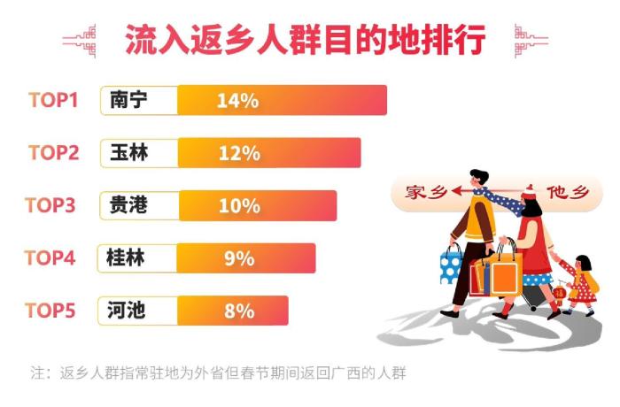 春節(jié)期間,廣西迎來客流高峰。據(jù)統(tǒng)計(jì),廣西流入客流同比增長(zhǎng)7%,流出客流同比增長(zhǎng)18%,凈增客流超過1000萬人。其中,返桂人潮占比25%,男性成為返鄉(xiāng)主力,占比58%?!?0后”和“90后”人群成為返鄉(xiāng)主流,占比超過50%。交通出行方面,短途游備受青睞,200-500公里出行占比達(dá)到48%,汽車成為首選出行方式。