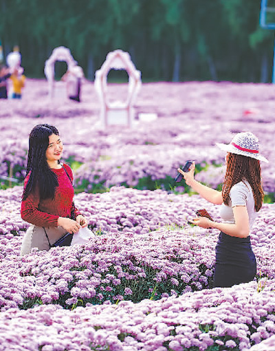 中國游客在泰國曼谷都會區(qū)的松樹天堂陽光公園拍照打卡。
