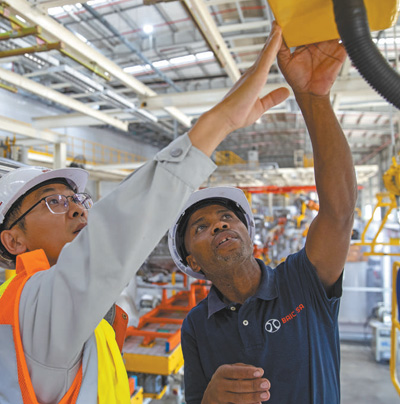 中國(guó)和南非兩國(guó)員工在南非東開普省北汽南非工廠焊裝車間內(nèi)工作。