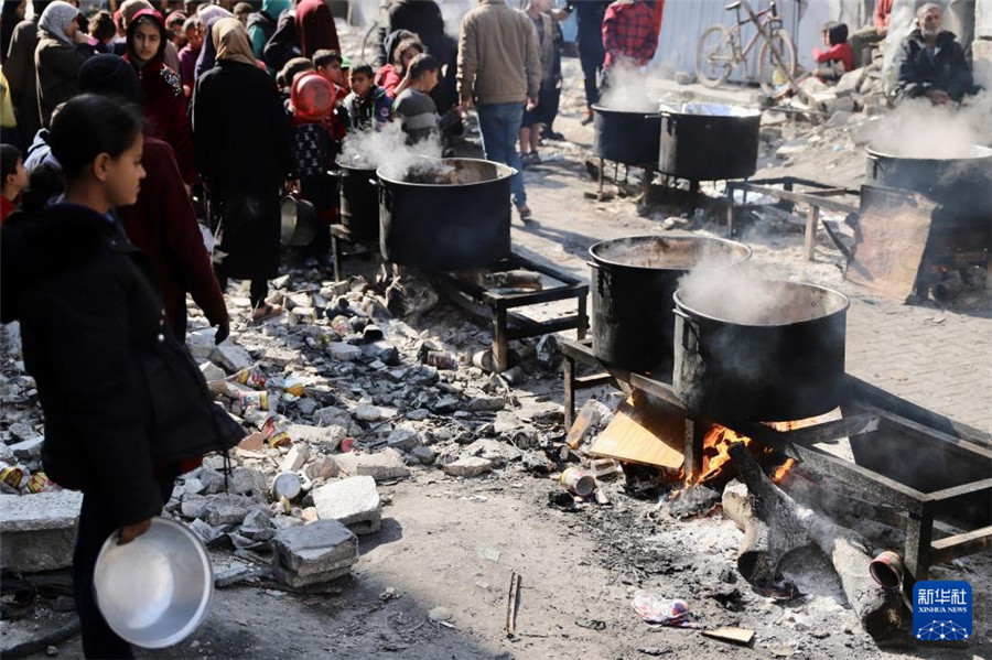 2月27日,在加沙地帶北部的杰巴利耶難民營,人們等待領取食物。新華社發(fā)(穆罕默德·阿里攝)