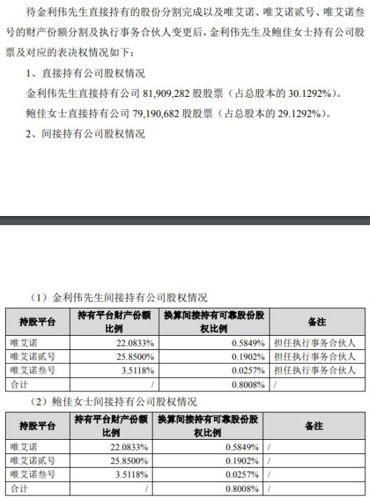 公告顯示,金利偉和鮑佳持有的唯艾諾、唯艾諾貳號、唯艾諾叁號三家合伙企業(yè)的財產(chǎn)份額由雙方均等分割,各占一半。唯艾諾貳號、唯艾諾叁號的執(zhí)行事務(wù)合伙人將變更為金利偉。變更后,三家合伙企業(yè)的執(zhí)行事務(wù)合伙人均為金利偉。