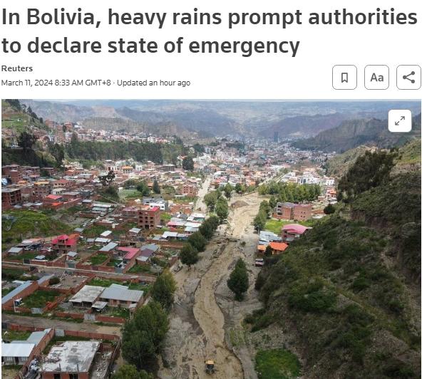 據(jù)此前報(bào)道,自3月開始,拉巴斯遭遇持續(xù)降雨,山體滑坡、洪水、泥石流等自然災(zāi)害多發(fā)。官方數(shù)據(jù)顯示,自1月雨季開始以來,玻利維亞全國(guó)各地已有近50人死于洪水。