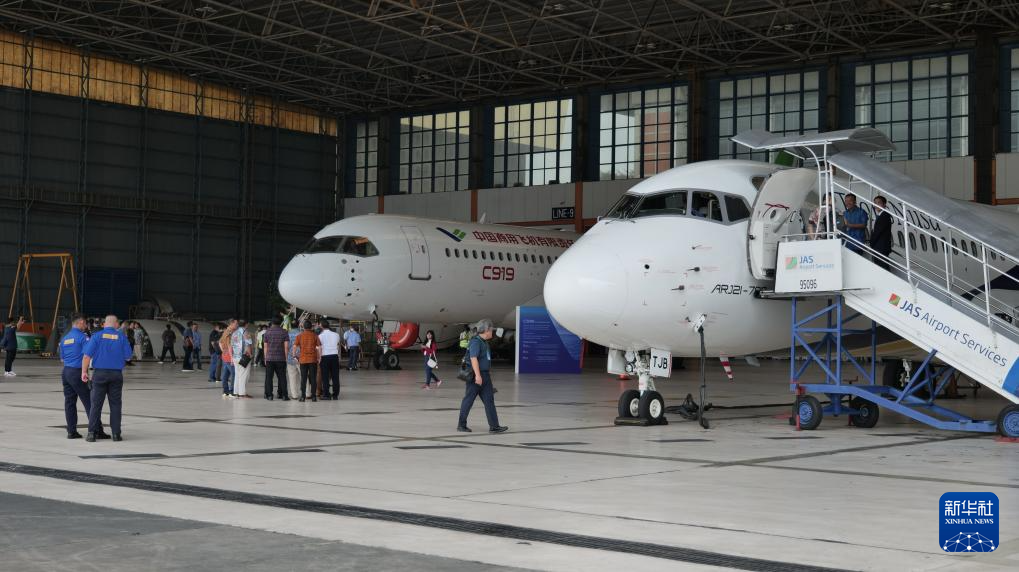 3月10日,中國商飛ARJ21(右)和C919飛機(jī)在印度尼西亞首都雅加達(dá)蘇加諾-哈達(dá)國際機(jī)場機(jī)庫作靜態(tài)展示。新華社記者 葉平凡 攝