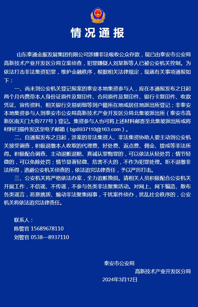 中新網(wǎng)3月13日電 山東泰安高新警方12日在官方微信公眾號(hào)發(fā)布山東泰通金服發(fā)展集團(tuán)有限公司涉嫌非法吸收公眾存款的情況通報(bào),目前該案件已由泰安市公安局高新技術(shù)產(chǎn)業(yè)開(kāi)發(fā)區(qū)分局立案?jìng)刹?,犯罪嫌疑人劉某新等人已被公安機(jī)關(guān)控制。為依法打擊非法集資犯罪,維護(hù)金融秩序,根據(jù)相關(guān)法律規(guī)定,現(xiàn)就有關(guān)事項(xiàng)通報(bào)如下: