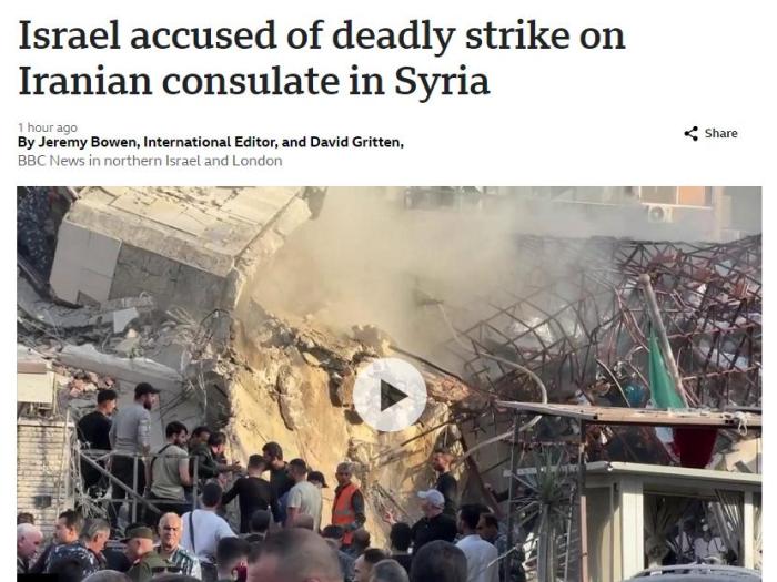 報(bào)道援引伊朗駐敘利亞大使侯賽因·阿克巴里的話稱,伊朗大使館旁邊的領(lǐng)事部門建筑“遭到以色列F-35戰(zhàn)機(jī)發(fā)射的六枚導(dǎo)彈襲擊”。伊朗媒體發(fā)布的視頻還顯示,現(xiàn)場(chǎng)遭到嚴(yán)重破壞,并起火冒煙。