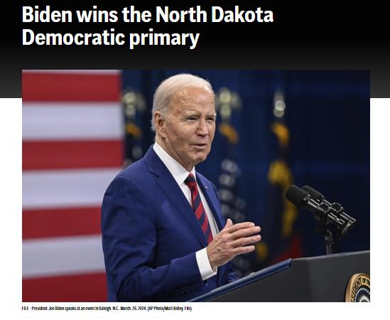 中新網3月31日電 據美聯社報道,當地時間30日,根據計票結果顯示,美國現總統拜登贏得2024年美國總統選舉北達科他州民主黨初選。