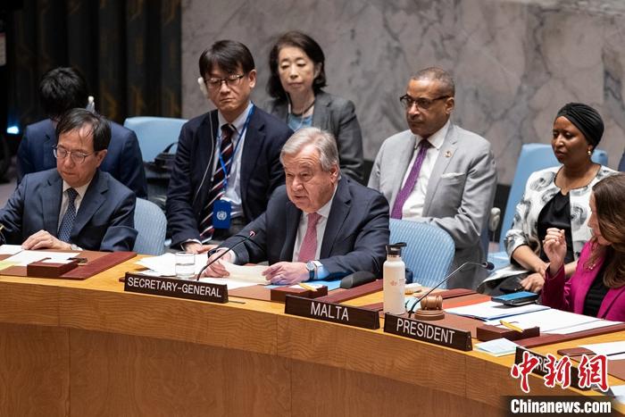 當?shù)貢r間4月14日,聯(lián)合國安理會就伊朗襲擊以色列在紐約聯(lián)合國總部召開緊急會議。圖為聯(lián)合國秘書長古特雷斯發(fā)言。 中新社記者 廖攀 攝