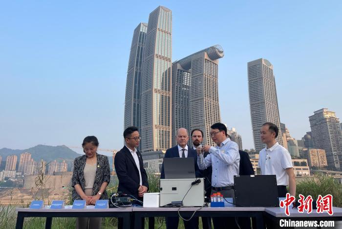 圖為朔爾茨(左三)在長(zhǎng)江和嘉陵江交匯處了解兩國(guó)科學(xué)家水質(zhì)檢測(cè)項(xiàng)目。中新社記者 劉相琳 攝