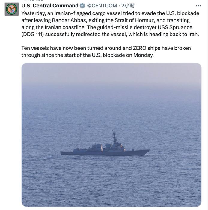 美軍中央司令部表示,自13日美軍開始實施封鎖以來,已有10艘船只被勒令返航,尚無船只突破封鎖。