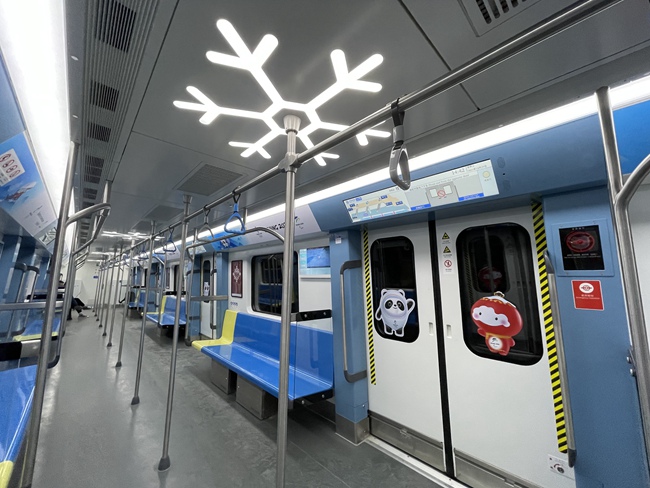登上車廂,隨處可見冬奧元素。車頂?shù)臒魩Р辉賳握{,而是被設計成了雪花的形狀,車廂扶手也融入了冰球桿的設計。而在車門上,北京冬奧會吉祥物“冰墩墩”和“雪容融”仿佛在和乘客們招手。
