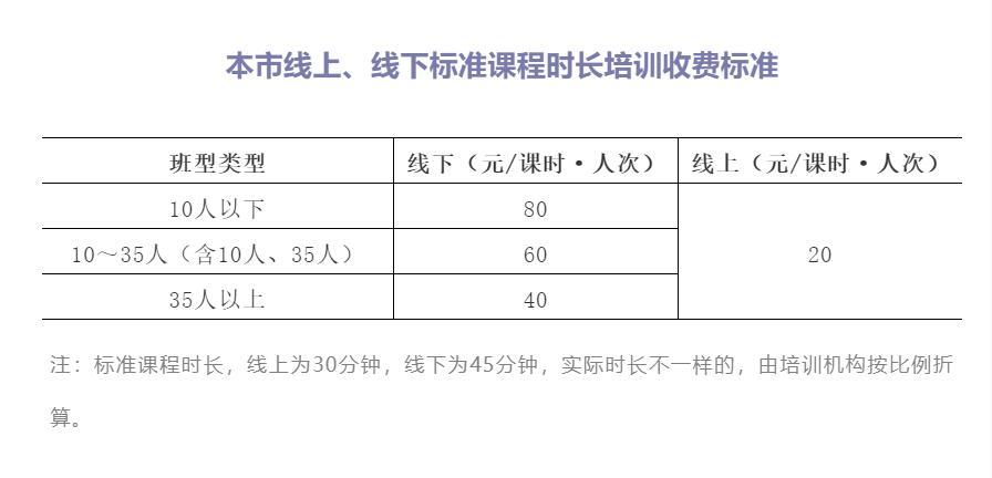 按照國家“要區(qū)分線上和線下以及不同班型,分類制定標準課程時長的基準收費標準”的要求,根據(jù)國家規(guī)定的主要定價班型,確定了本市線上、線下學科類校外培訓的基準收費標準和浮動幅度。