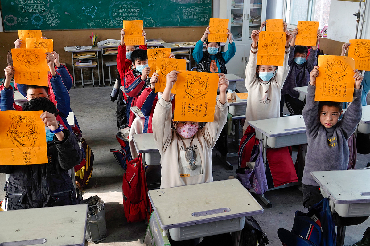 1月7日,山西省運(yùn)城市新絳縣澤掌鎮(zhèn)光村小學(xué),絳州木版年畫工藝師們帶著新創(chuàng)作的虎年生肖虎木版走進(jìn)校園,同小學(xué)生們一起印制生肖虎年畫,傳承非遺民俗。