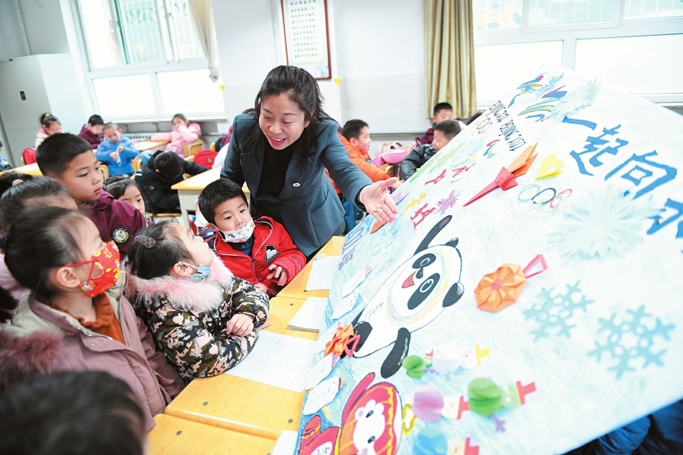 1月6日,太原市第二實驗小學,孩子們在與老師的互動中學習知識。該校積極響應“雙減”政策,為一、二年級學生開展“巧娃迎冬奧”等主題綜合素質(zhì)大比拼,讓孩子們在動手、動腦、小組合作中輕松快樂地開展自主、合作、探究性學習。(記者阮洋攝)